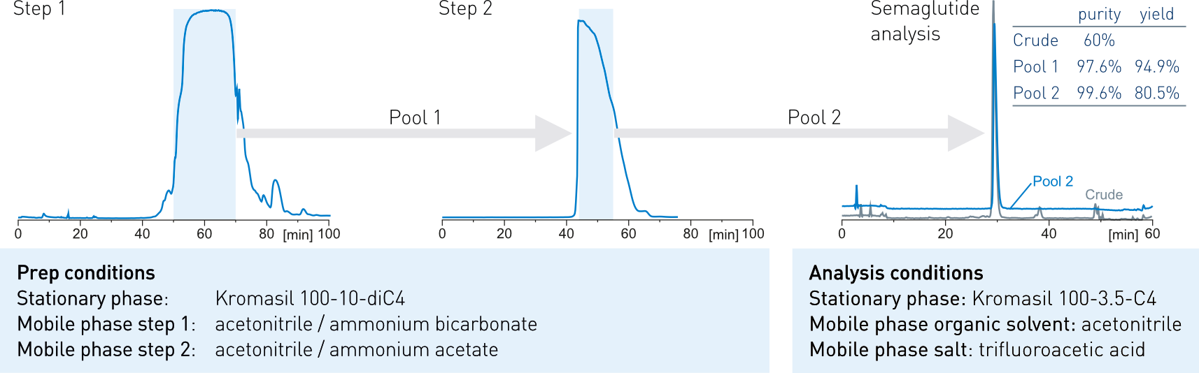 The Kromasil® diC4 stationary phase is a HPLC phase targeting the purification of peptide and biomolecules. With 100 Å pore size it has shown to be highly efficient to reach purity levels over 99.5% for GLP-1 receptor agonists like Liraglutide and Semaglutide, even with crudes with a target product purity as low as 15%. In 300 Å, the purification of larger biomolecules can also be addressed.